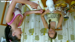 Mature lesbian Franny eats Sarah Cute's slit in the kitchen