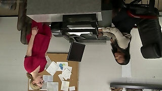 In the office a black girl and milky woman hook up on a couch