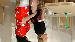 Splendid maid in uniform and horny domme are making love in the kitchen