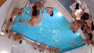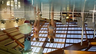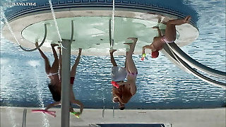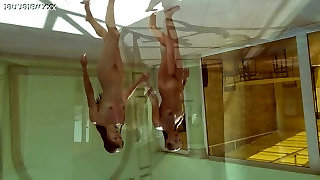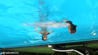 Two white young magnificent girls dive in the pool and unclothe on cam
