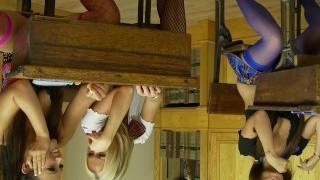 Brunette schoolgirl opens her shaved pussy for blonde MILF